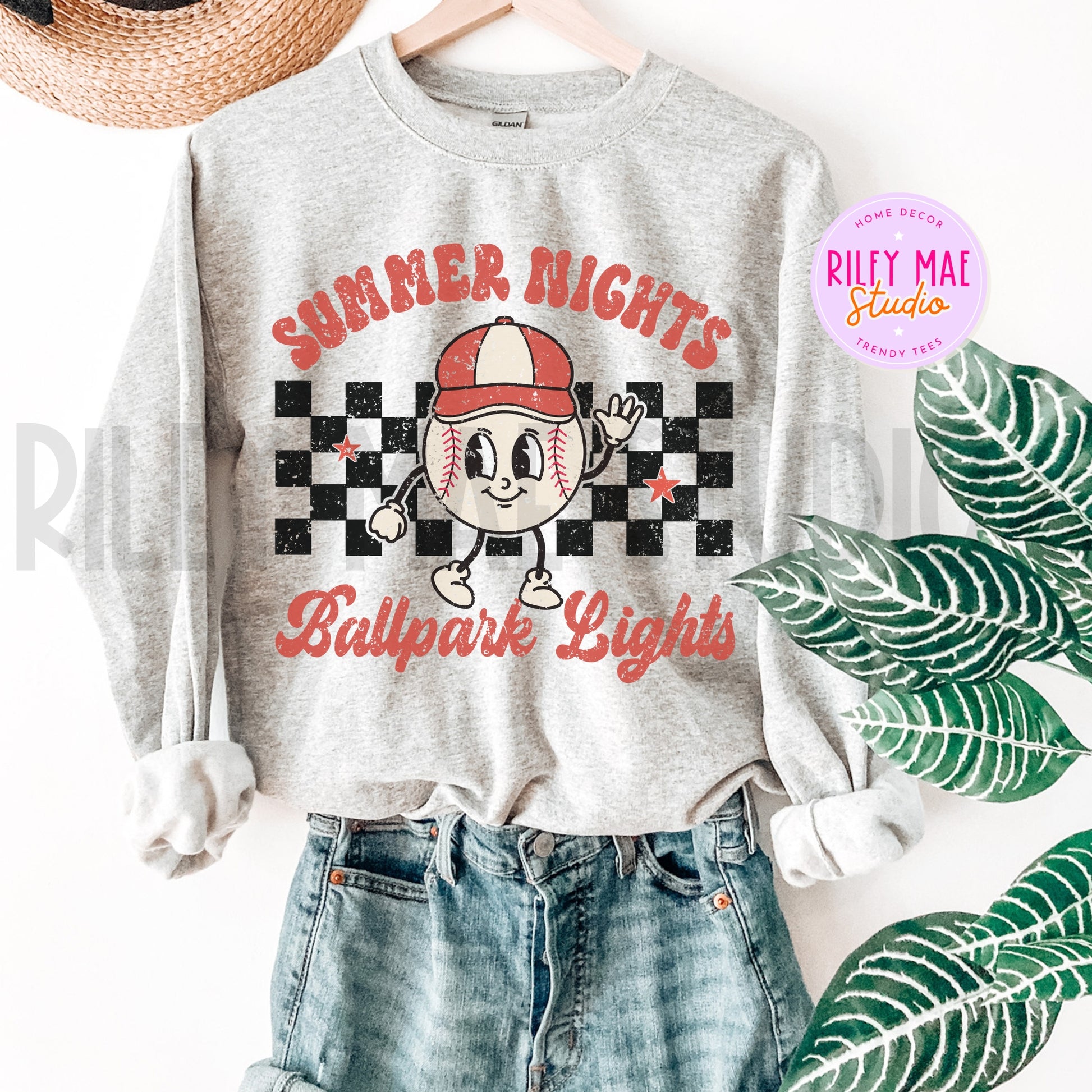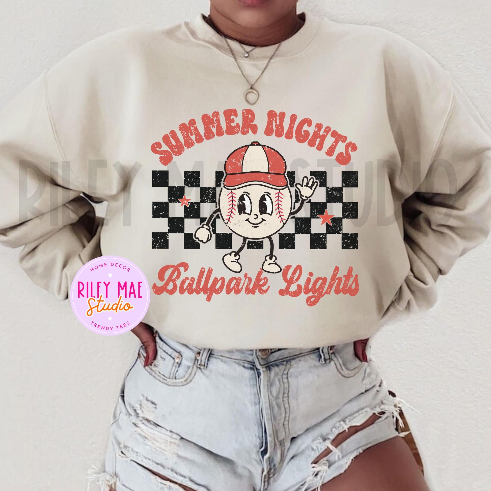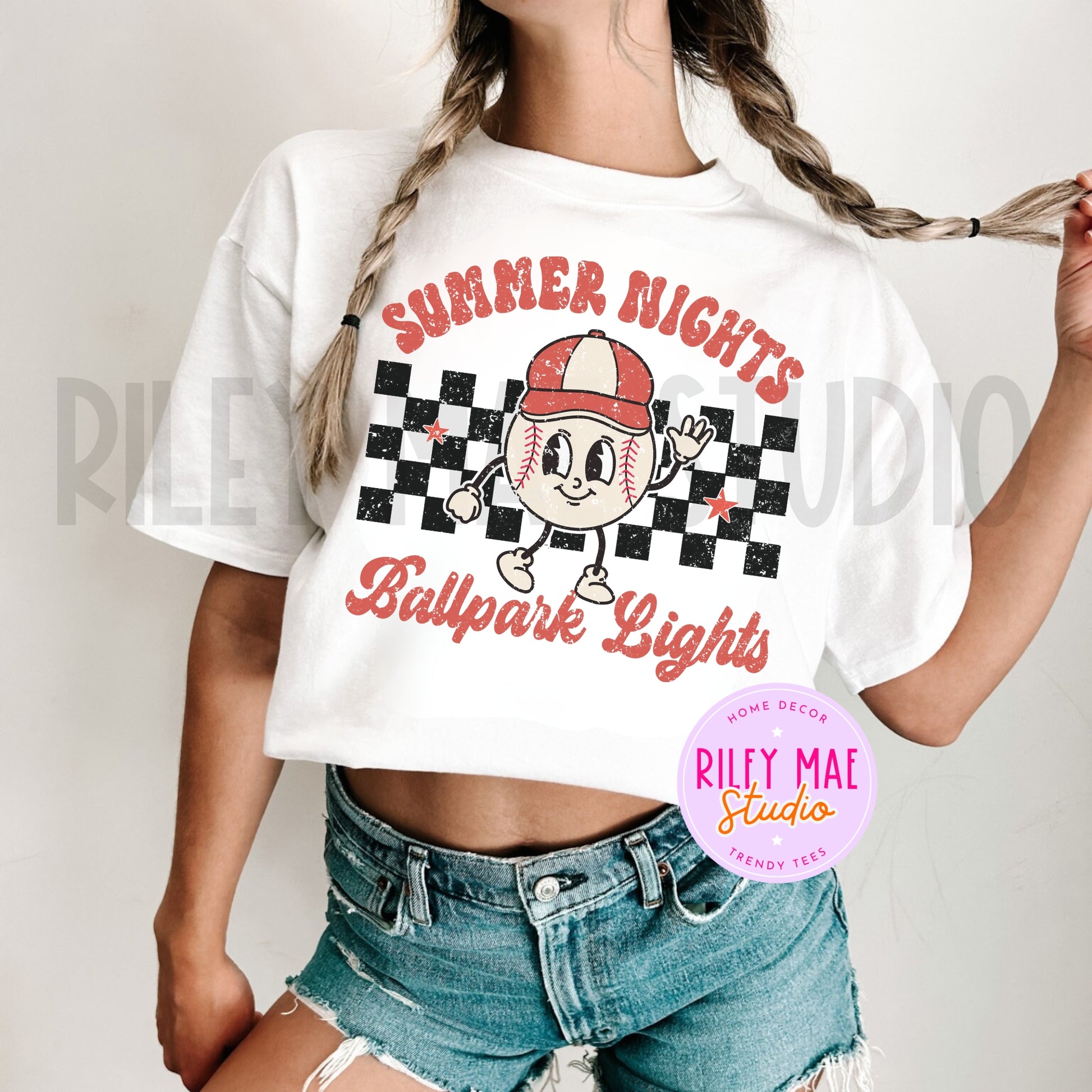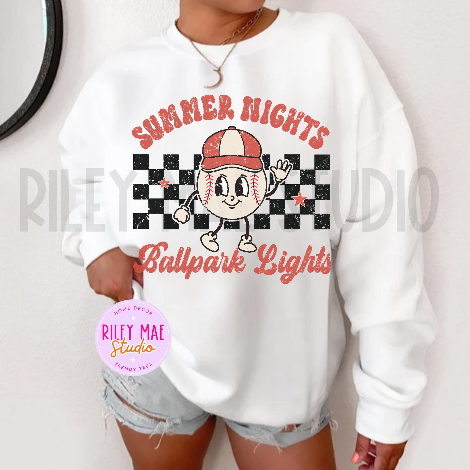 Summer Nights Ballpark Lights Baseball Distressed Shirt