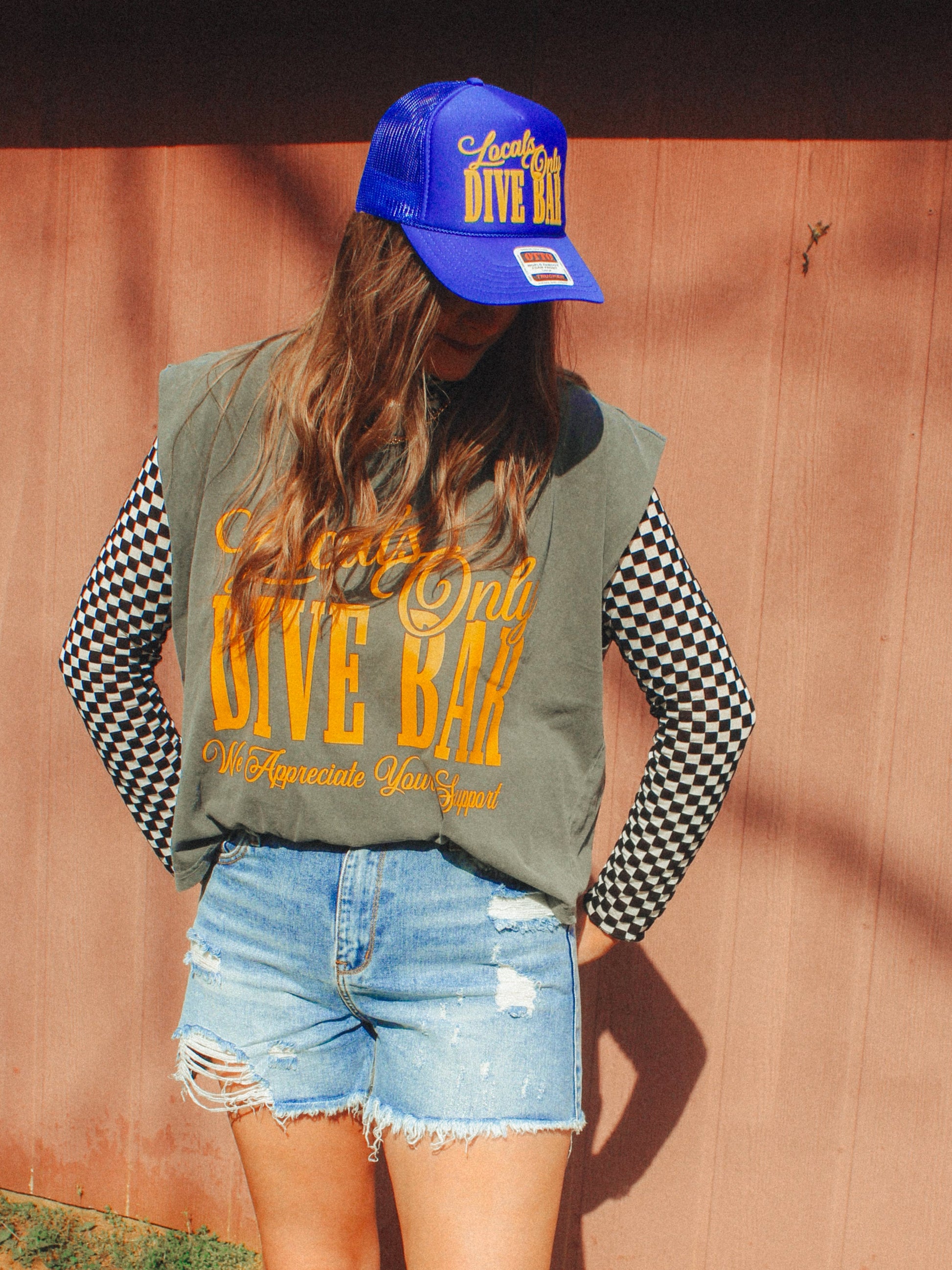 Get all of the Dive Bar vibes in our oversized Locals Only Diver Bar, western inspired 90's style cropped tank!